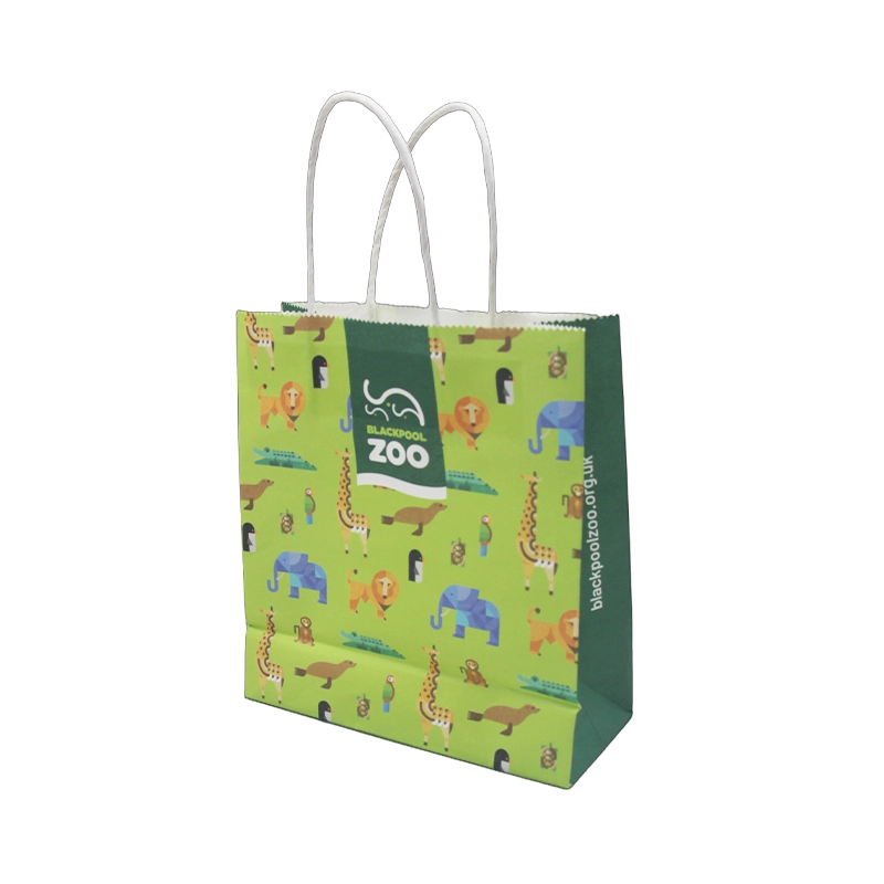 Denne bærbare gavepapirpose har en frisk grøn grundfarve med sjove tegneseriedyrsmønstre trykt over det hele. Det inkluderer klassiske zoologiske havebilleder som giraffer, løver, elefanter og pingviner. Det centrale område er skræddersyet med "BLACKPOOL ZOO"-mærkelogoet, hvilket skaber en livlig og legende atmosfære, samtidig med at den bærer en følelse af minde.